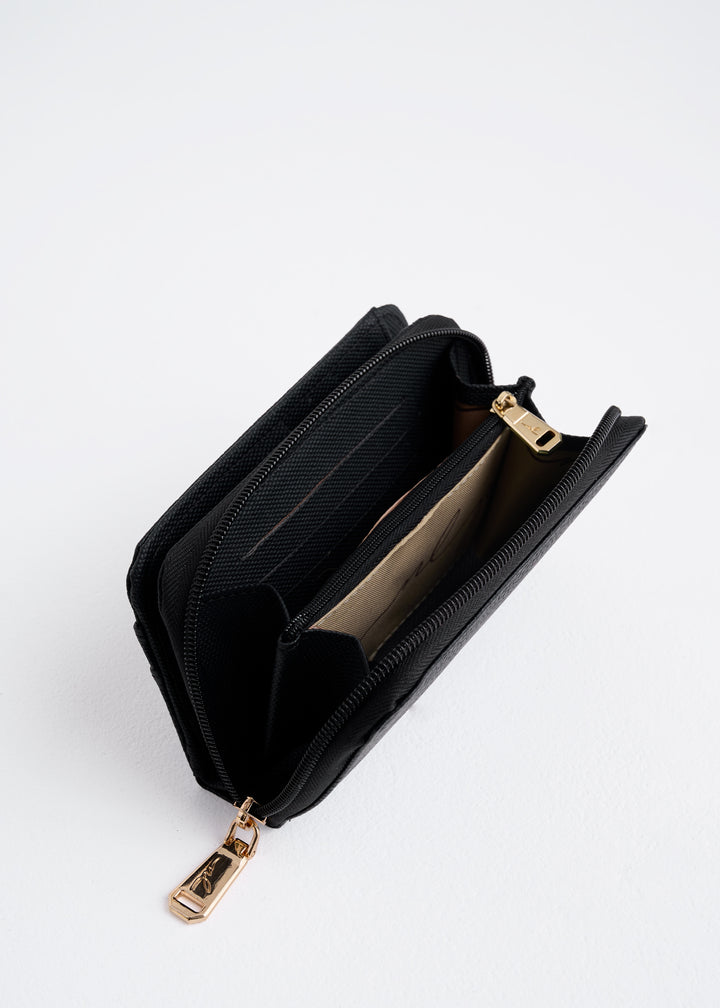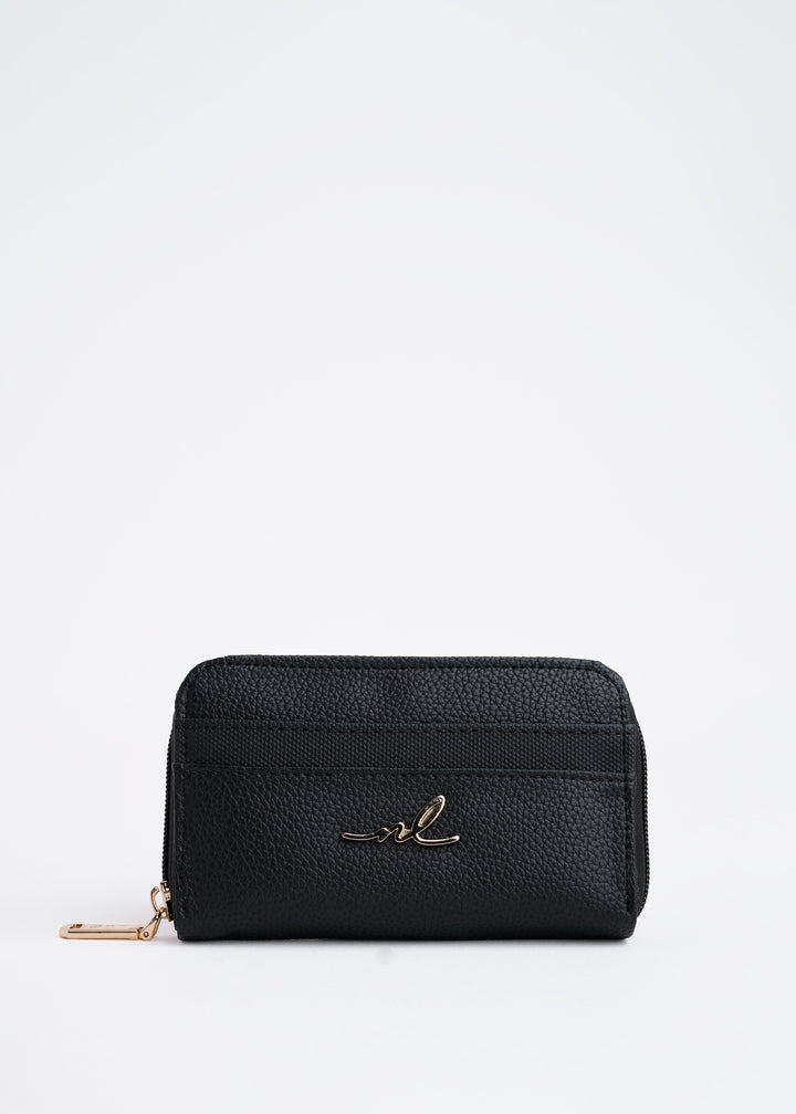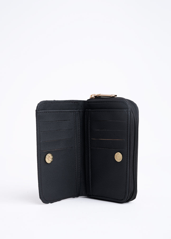 Su diseño compacto incluye compartimentos interiores para billetes, tarjetas y monedas, además de un logo metálico frontal y cierre que aporta seguridad. De estilo urbano y minimalista, es ideal para combinar con cualquier look.
