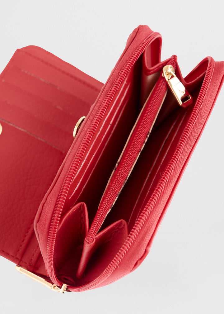 Los herrajes metálicos dorados aportan un toque sofisticado que resalta con el vibrante tono rojo, convirtiéndola en un accesorio versátil y elegante para usar a diario o complementar tus looks con un detalle lleno de personalidad.