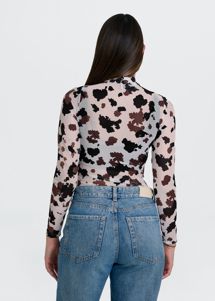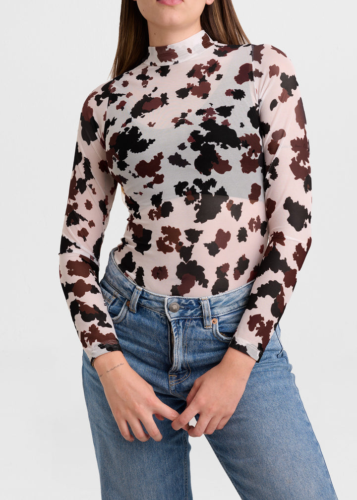 Body en tela mesh estampada, ligera y elástica, perfecta para crear looks con estilo. Su cuello semicisne y diseño ajustado realzan la figura, mientras que el estampado en tonos tipo vaca aporta un toque moderno y diferente.