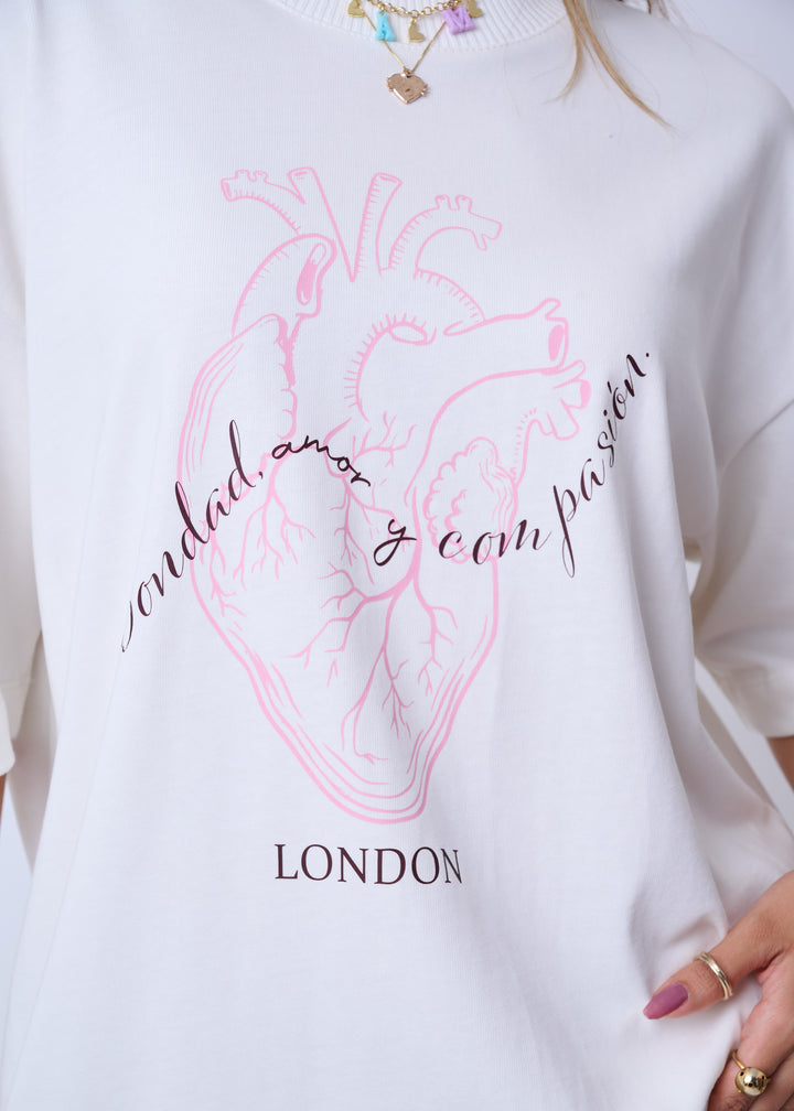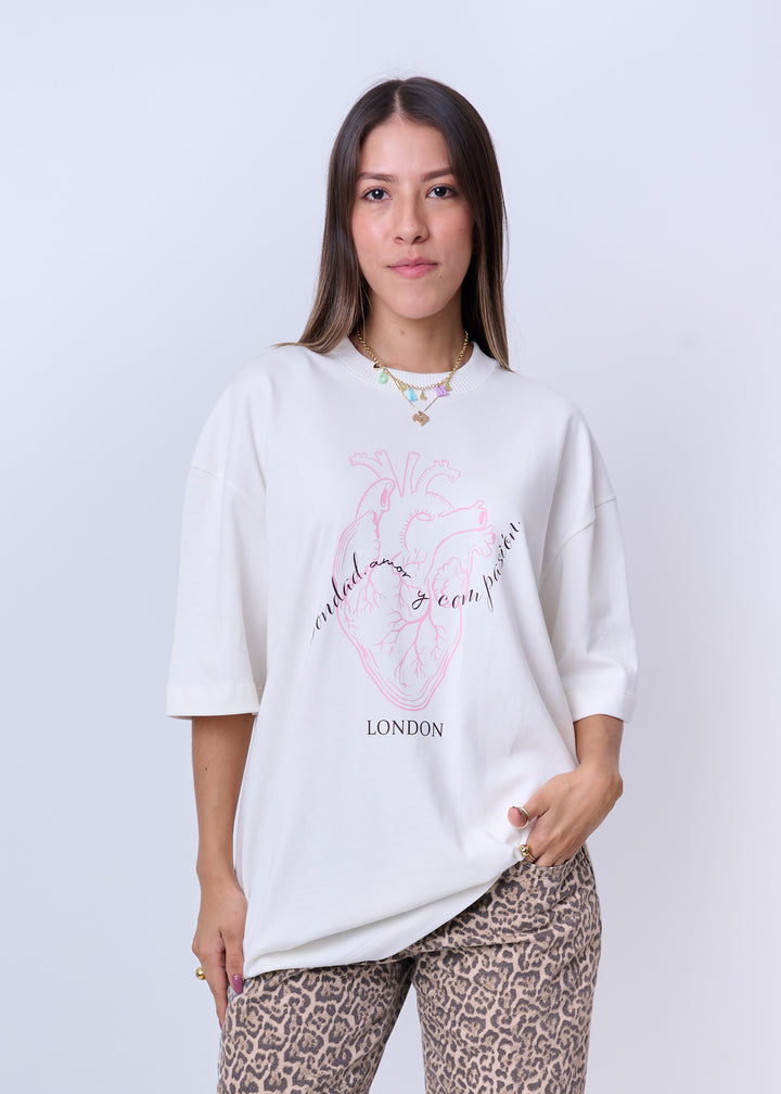 Una prenda que combina estilo, fuerza y un mensaje poderoso. La camiseta Oversize Equilibrio está confeccionada en algodón de 300 gramos, ofreciendo una estructura firme y un tacto suave. Su estampado frontal con ilustración anatómica de corazón y la frase “bondad, amor y con pasión” transmite una vibra auténtica, mientras el detalle gráfico en la espalda le da un toque original y artístico.