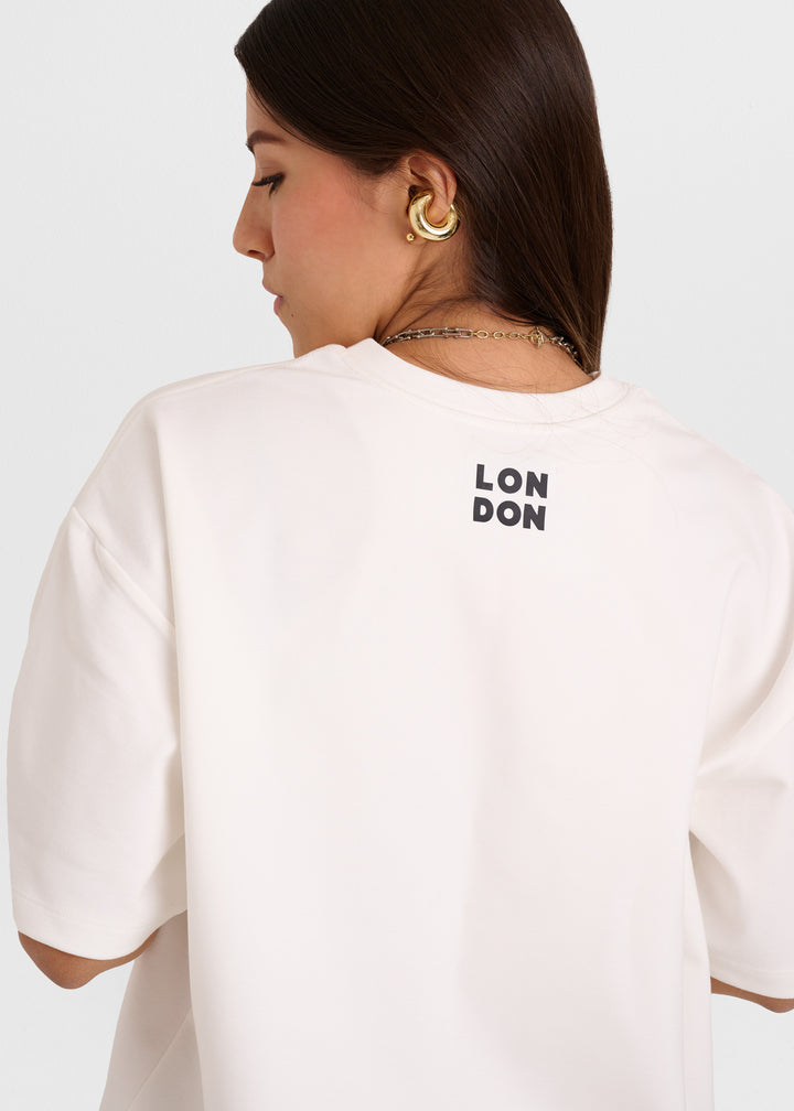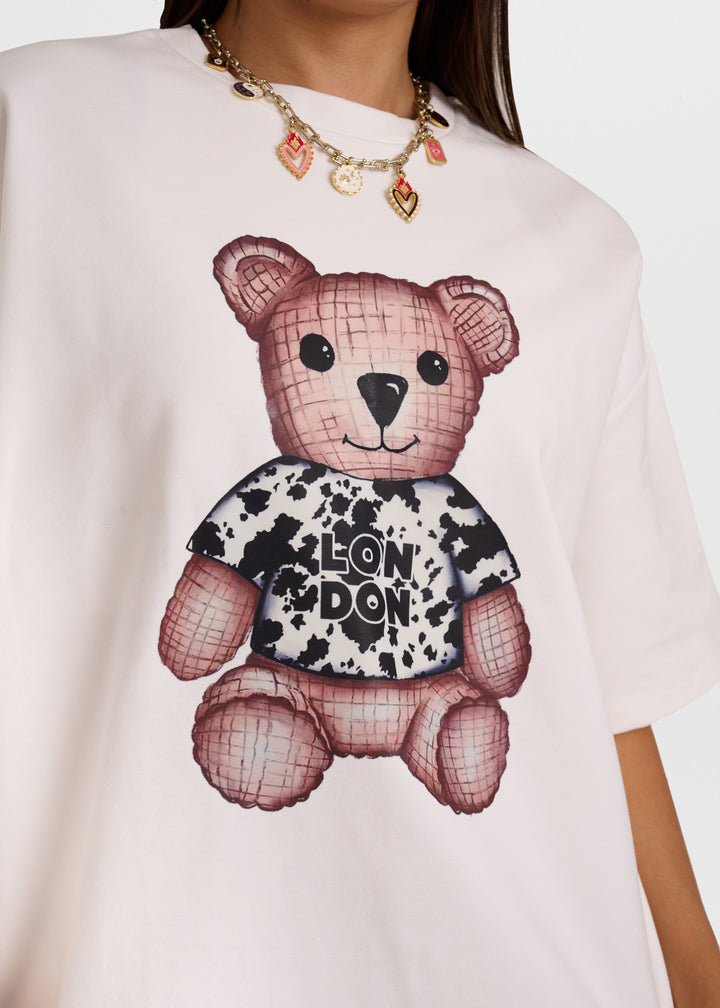 Su estilo oversize le da un aire relajado y actual, mientras que el estampado de oso con camiseta estampada “London” en la parte frontal aporta un toque juvenil y diferente. Disponible en color blanco y negro, es perfecta para usar con jeans, shorts o faldas y crear looks casuales con personalidad. En la parte posterior incluye el detalle del logo “London” que refuerza su esencia urbana y trendy.