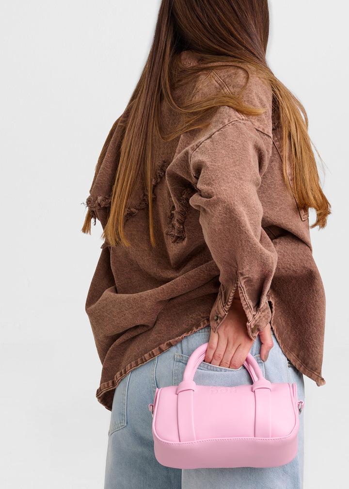 Dale un toque dulce y moderno a tu look con la Mini Cartera Ermita. Su diseño tipo baúl en material tipo cuero con textura suave y acabado mate la hace ideal para llevar lo esencial con estilo. Cuenta con asas superiores firmes y una correa ajustable y removible con detalle de franjas, que te permite usarla cruzada o al hombro según tu preferencia.