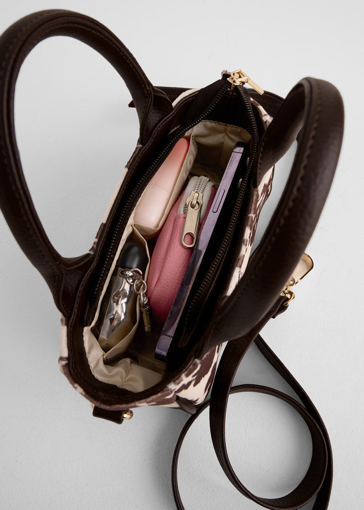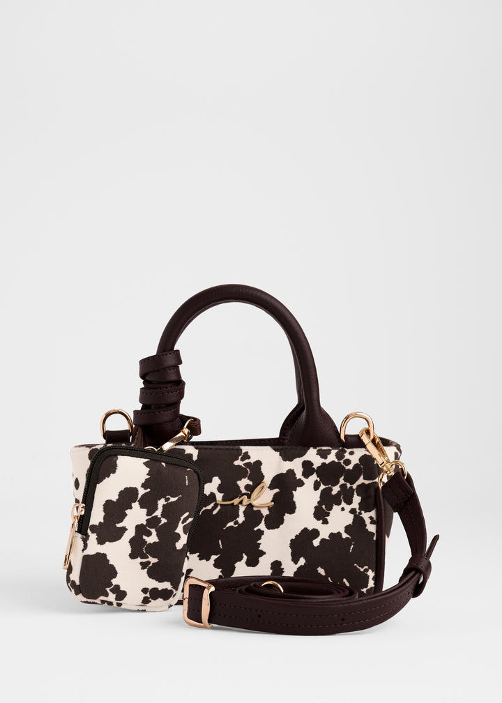 Mini cartera con diseño tipo vaquita en tonos café y blanco, confeccionada en lona resistente con asas estructuradas en contraste. Incluye correa ajustable para llevar al hombro o cruzada, y cierre superior con herrajes dorados que le dan un toque moderno. Compacta, pero con el espacio justo para lo esencial, es ideal para salidas casuales o looks con personalidad.