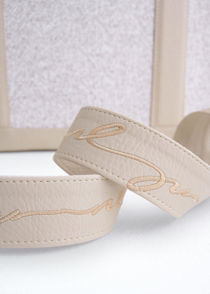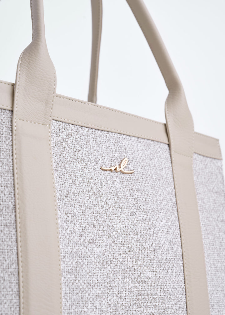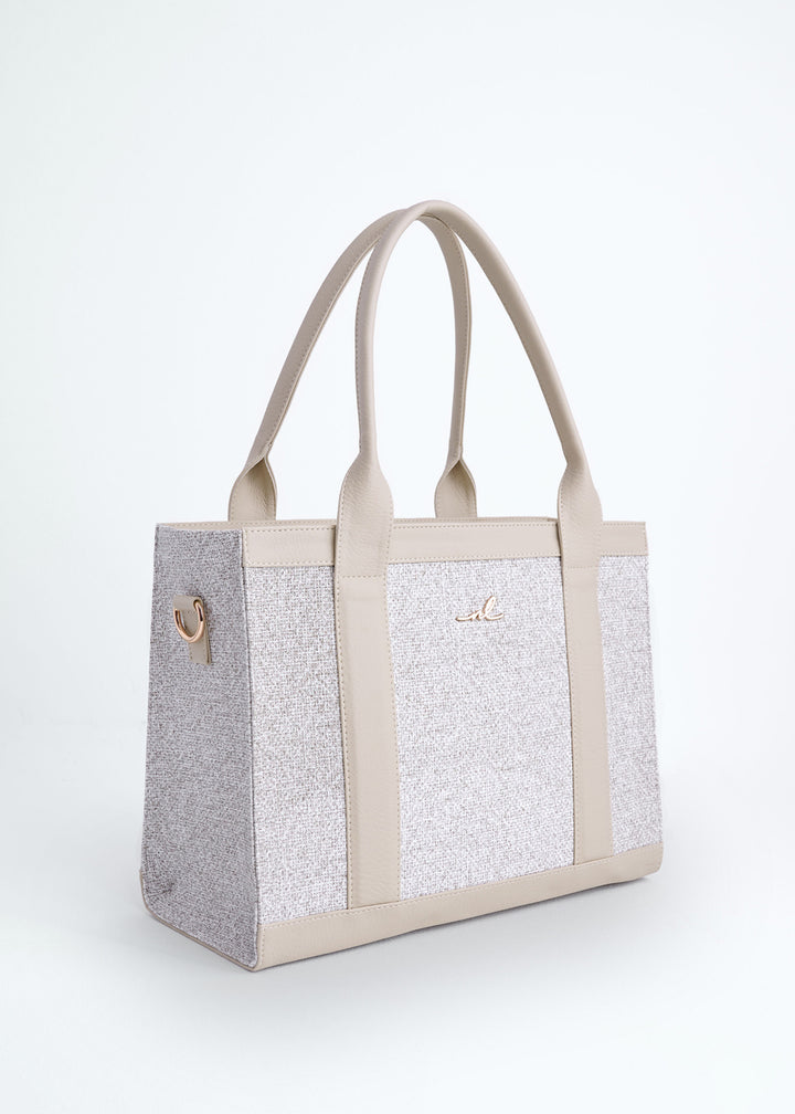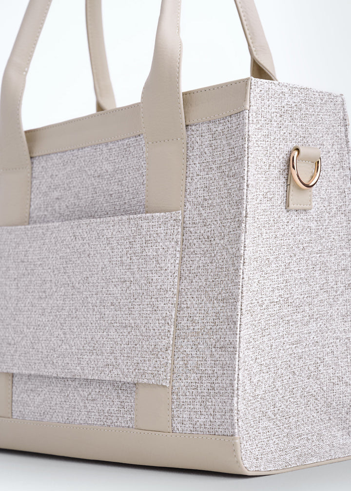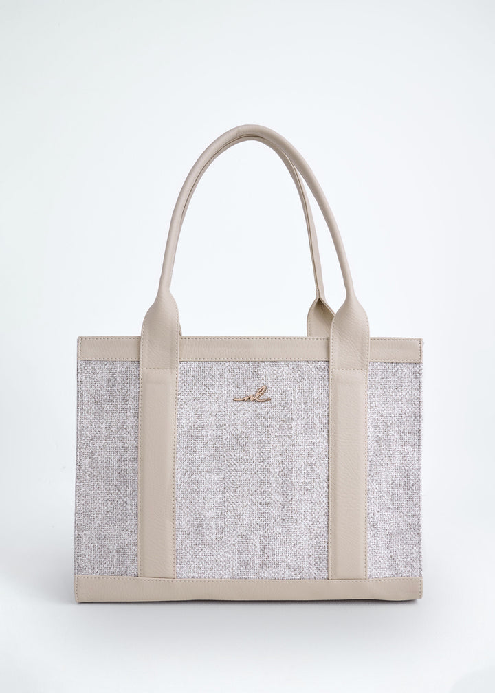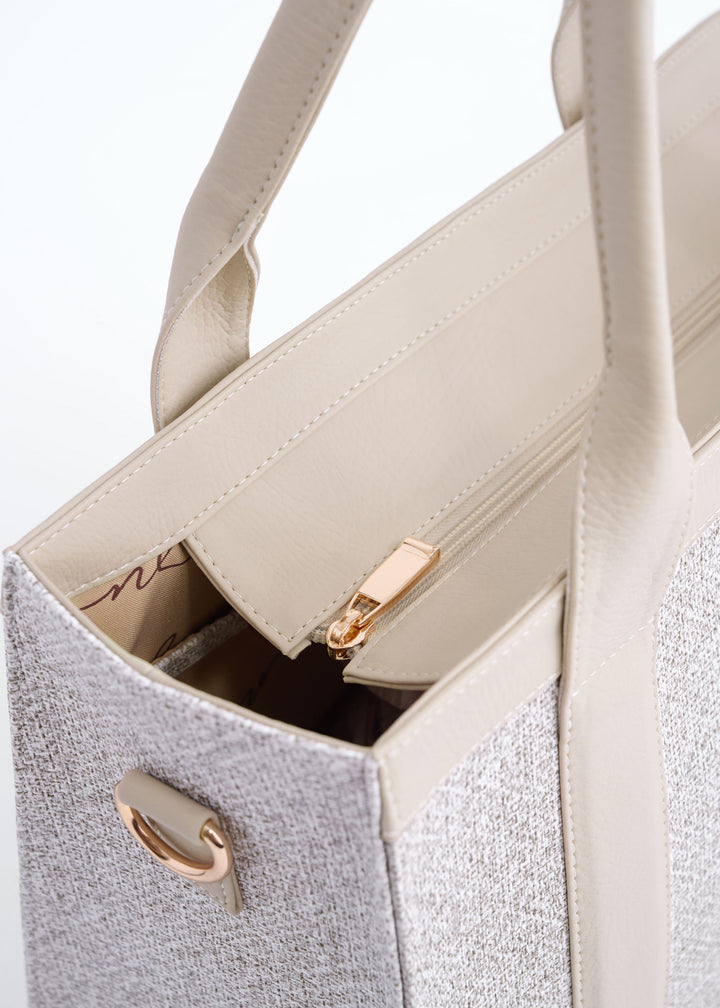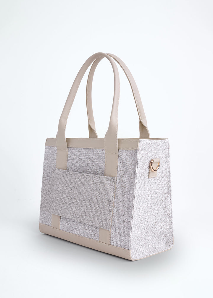 La Shopper Viena en tono gris combina elegancia y practicidad en un diseño moderno y atemporal. Confeccionado en una mezcla de textiles y acentos en cuero sintético, ofrece una textura visual atractiva y una estructura firme que mantiene su forma.