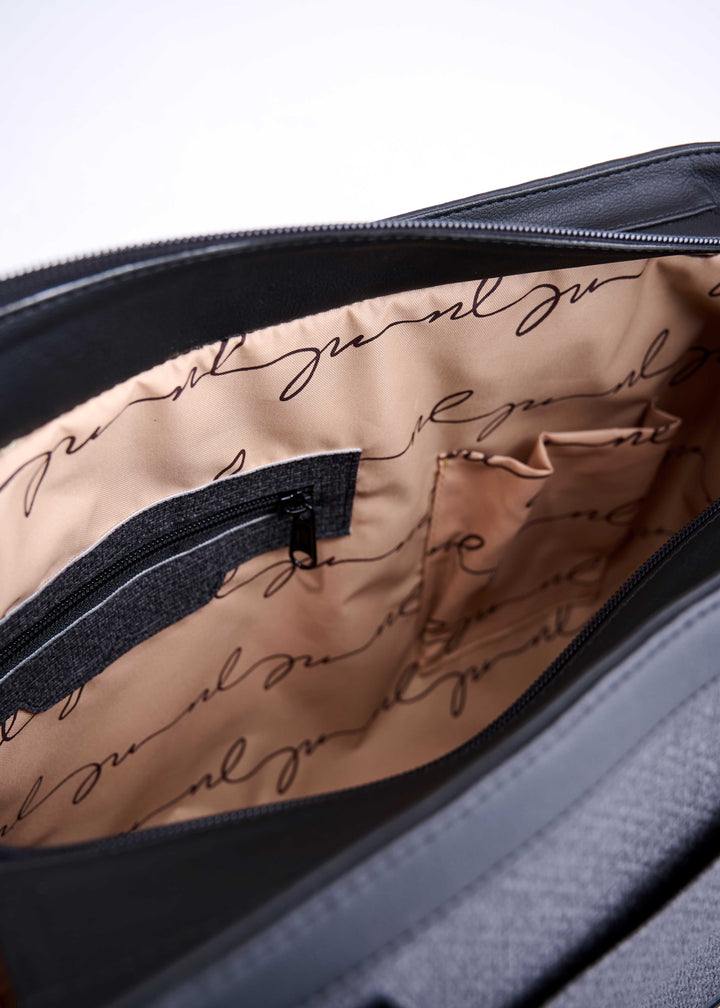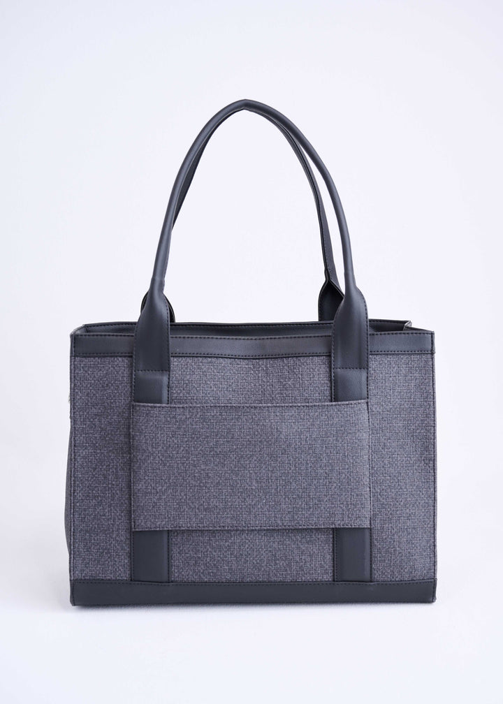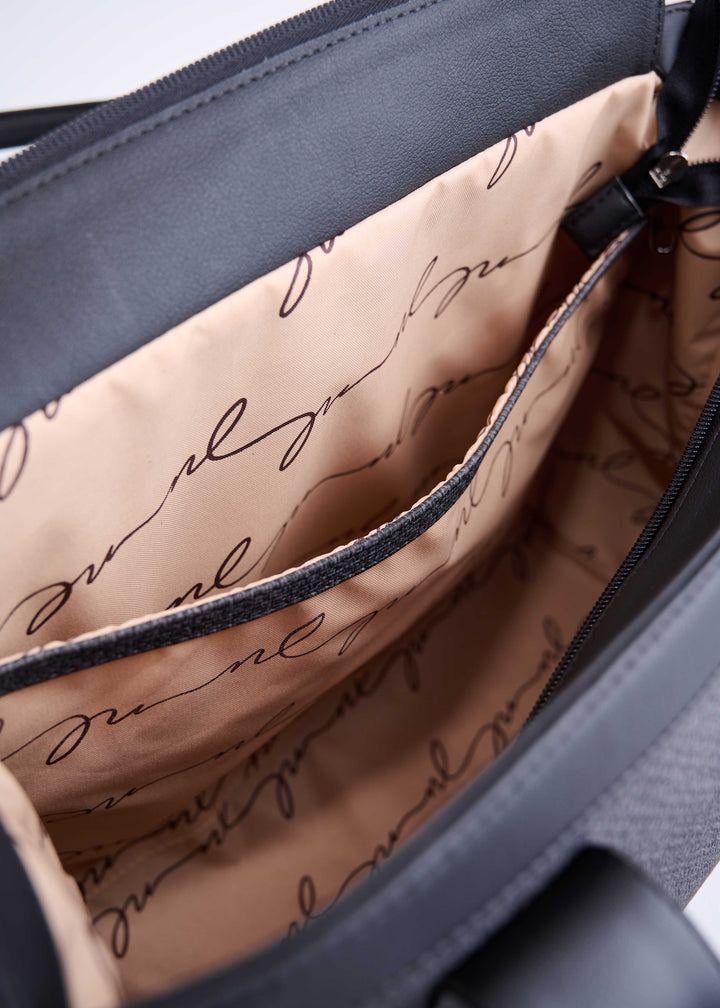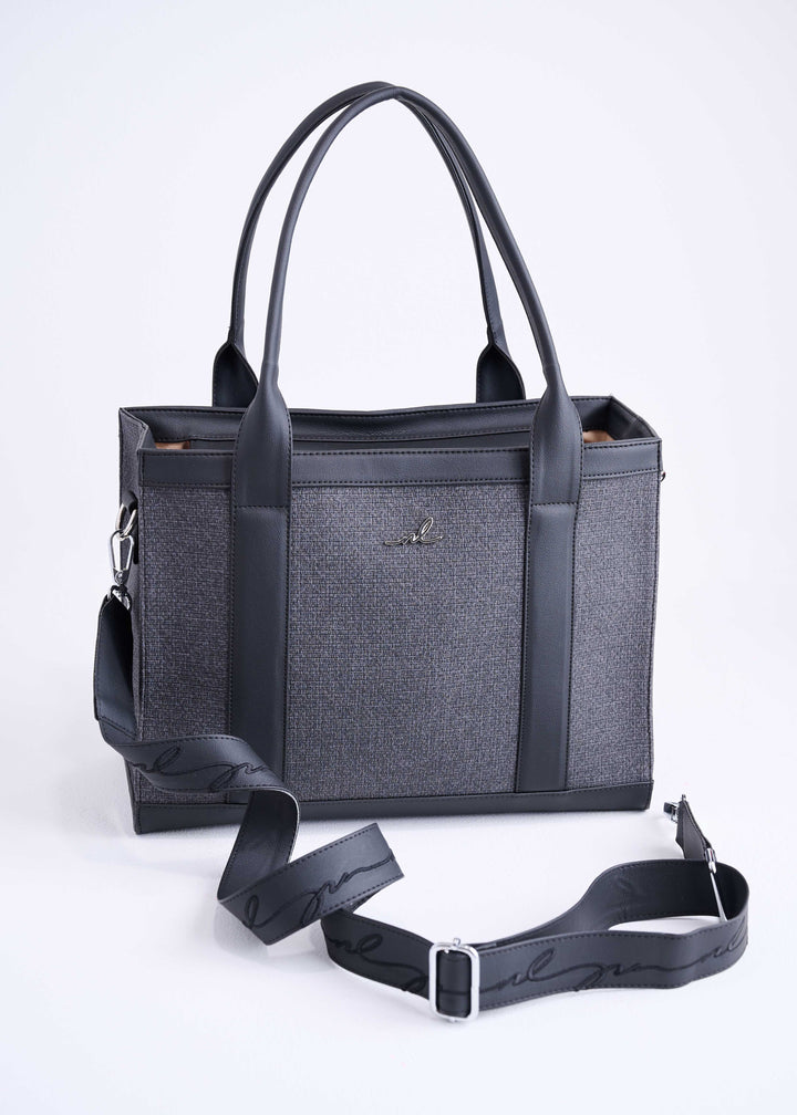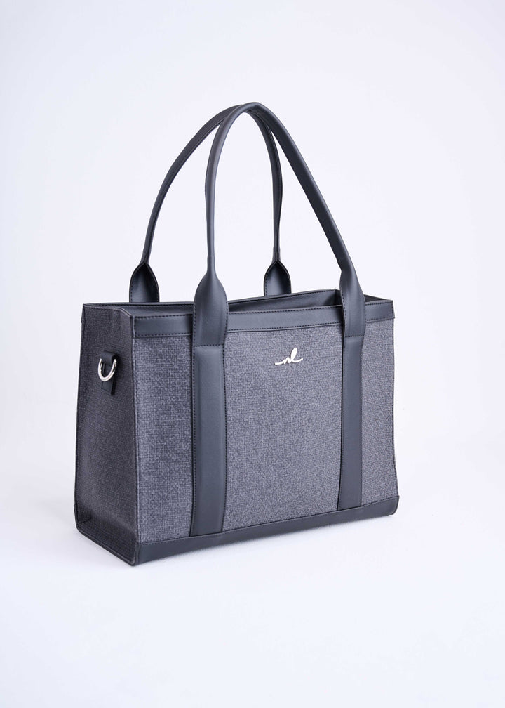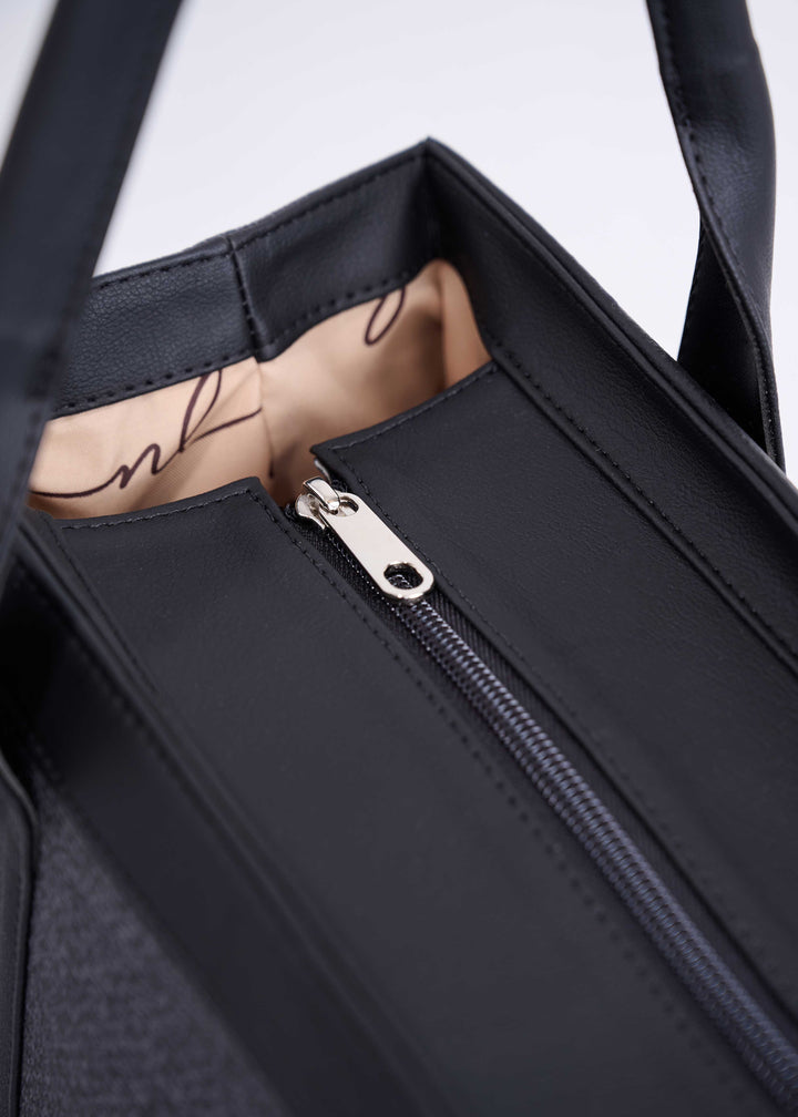 La shopper Viena en color negro combina elegancia y practicidad en un diseño moderno y atemporal. Confeccionado en una mezcla de textiles y acentos en cuero sintético, ofrece una textura visual atractiva y una estructura firme que mantiene su forma.