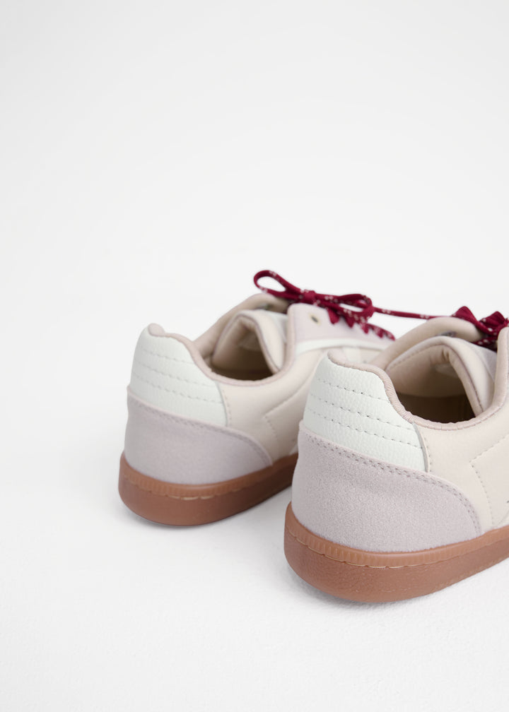 Su base en tono marfil con acabados en lona PVC y carnaza se combina con una suela caramelo que le da un look retro moderno. El detalle que roba miradas: los cordones en dos tonos que puedes intercambiar según tu ánimo.