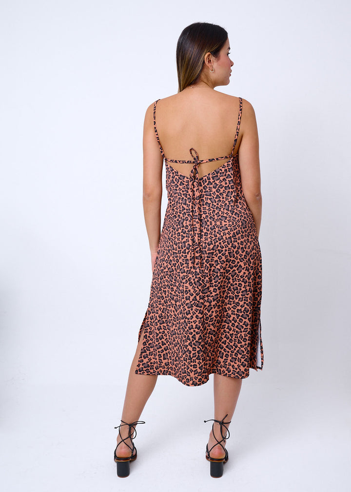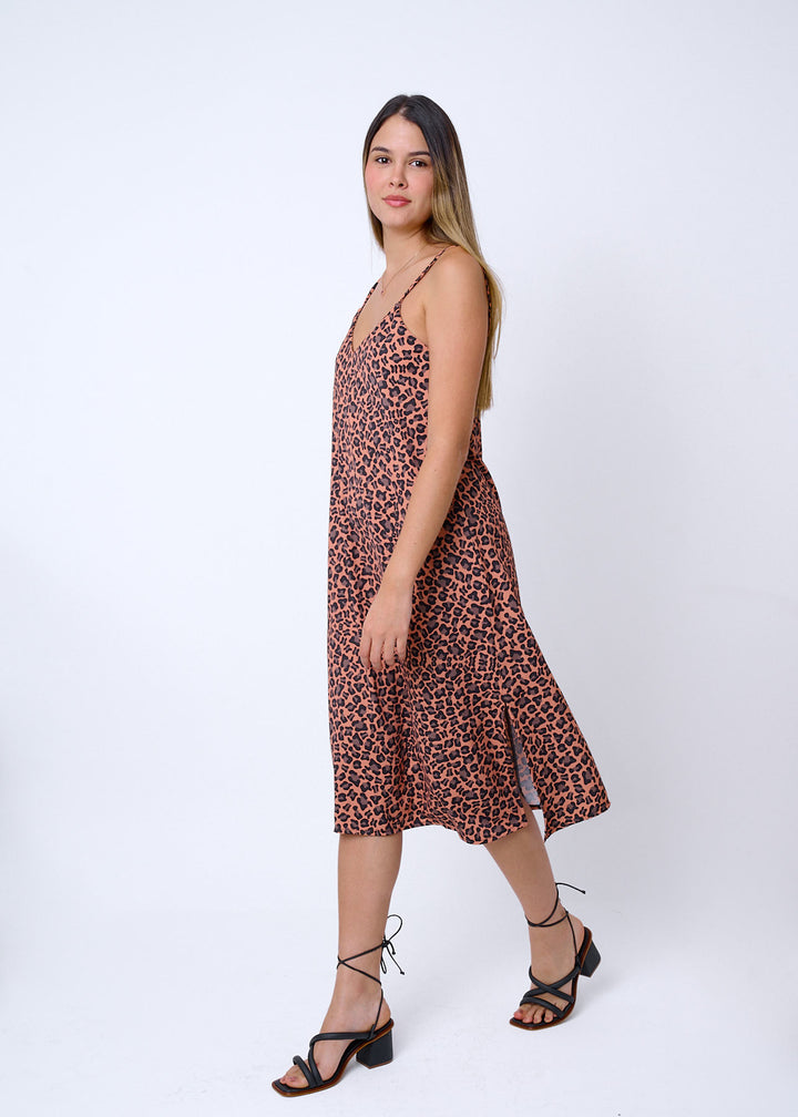 Confeccionado en 100% poliéster, este vestido resalta por su caída fluida y su textura suave al tacto, ideal para destacar tu feminidad en cada paso. Su estampado de animal print brinda un toque audaz y contemporáneo, perfecto para mujeres seguras y llenas de estilo.