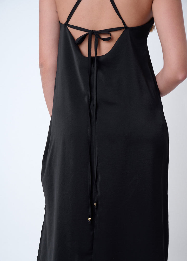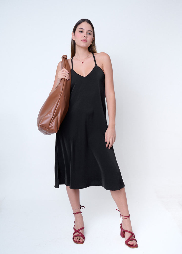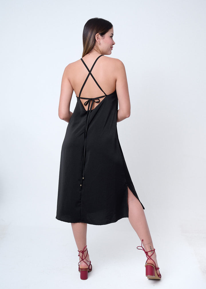El diseño de tirantes finos ajustables y su escote posterior con lazo decorativo ofrecen una silueta delicada y femenina. Su corte midi permite libertad de movimiento, mientras que su confección en tejido transpirable lo convierte en una opción fresca para días cálidos o noches especiales.